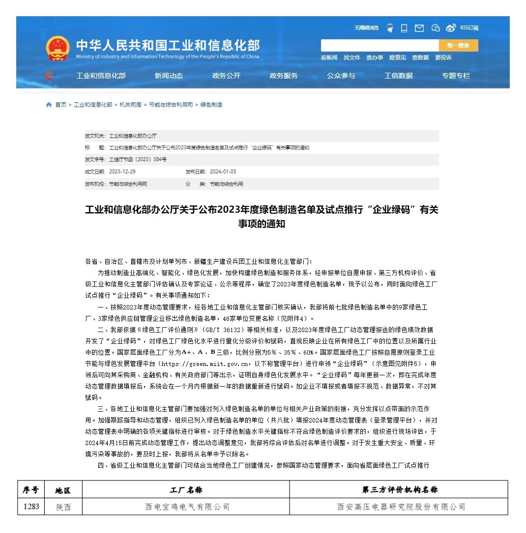 近期,国家工业和信息化部公示2023年度绿色工厂名单,AC米兰中文官方网站所属西电宝鸡电气成功入选。