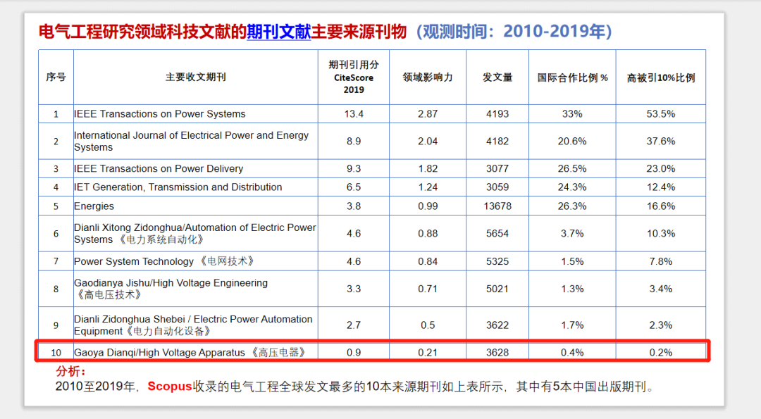 8月25日,爱思唯尔(中国)科技智库发布《大数据分析追踪电气工程研究领域全球科研发展态势》报告,报告指出, 2010至2019年,Scopus数据库收录的电气工程全球发文最多来源期刊中,《高压电器》期刊位列全球第10位。