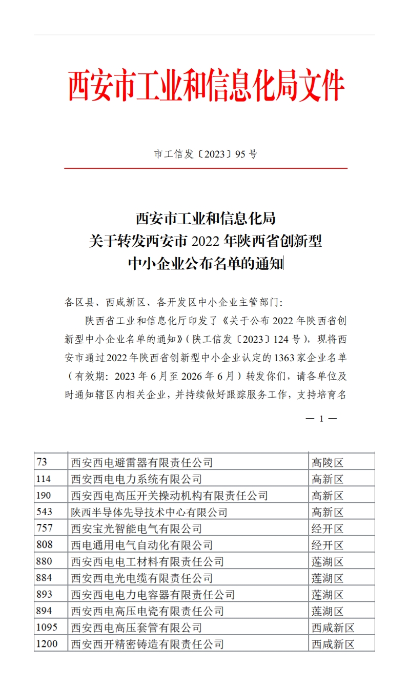 日前,陕西省工信厅印发《关于公布2022年陕西省创新型中小企业名单的通知》,文件公布了《西安市2022年陕西省创新型中小企业名单》,公司所属西电电力系统、西电套管、西电西容、西电西材、西电光电缆、西电避雷器、西电西瓷、西电操动机构、西电通用、西开铸造、宝光智能、先导中心成功入选,被认定为2022年陕西省创新型中小企业。