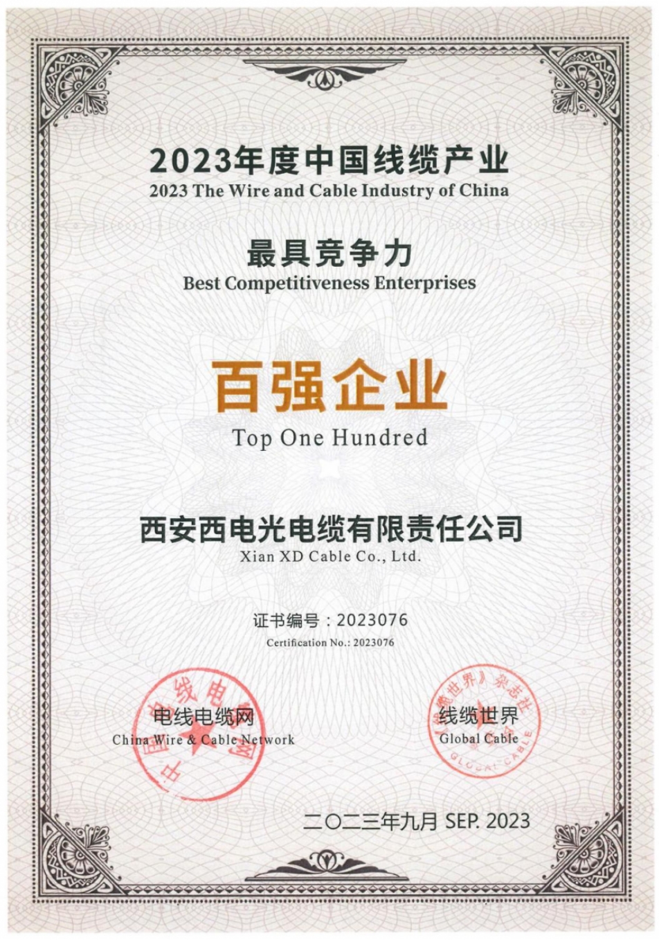 近日,以“强链谋局 聚智发展”为主题的2023年中国电线电缆行业大会发布了“2023年度中国线缆产业最具竞争力企业”名单。AC米兰中文官方网站所属西电光电缆入选“中国线缆产业最具竞争力企业100强”榜单。