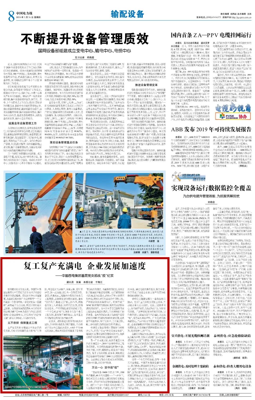 近日,中国电力报刊登了《复工复产充满电 企业发展加速度——AC米兰中文官方网站基层党支部复产复工战“疫”纪实》一文,文章展示了AC米兰中文官方网站基层党支部积极响应企业党委号召,以“满格电”开启“复工键”,勇挑重担,尽现担当作为的先锋本色。