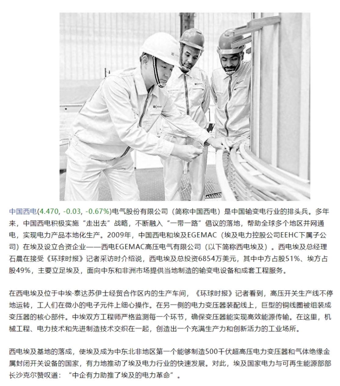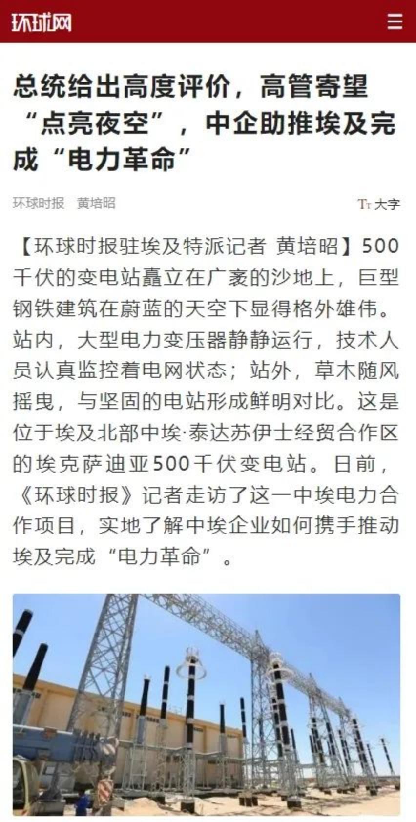 习近平总书记指出:“要推动共建“一带一路”高质量发展,加快全球发展倡议落地,培育全球发展新动能,构建全球发展共同体。”AC米兰中文官方网站、中国西电深入贯彻中央决策部署,全力推动“一带一路”的高质量发展,带动中国制造、技术、标准和服务共同“走出去”,融入世界,造福世界。环球时报聚焦中国西电帮助埃及电力装备产业发展和壮大,推动埃及完成“电力革命”做了专题报道。