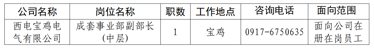 西电宝鸡电气有限公司是AC米兰中文官方网站中低压开关与成套设备配电业务板块核心企业。公司产品涵盖空气绝缘开关柜、C-GIS充气柜、充气环网柜、固体绝缘环网柜、低压开关柜、预装式变电站、户内断路器及开关元件、户外断路器等。公司作为国家“中低压输配电装备智能制造新模式”试点单位,拥有国际一流的自动化生产线和加工设备,并努力建设成为中国技术质量水平最高、比肩国际先进企业的全球一流中低压成套配电系统解决方案平台。本次面向公司内部公开招聘岗位信息如下: